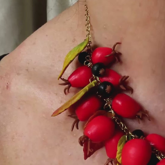 Inspirado en los matorrales que bordean los senderos de montaña, donde los escaramujos maduran con el primer frío, este collar rinde homenaje a la naturaleza en su momento más vibrante.