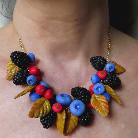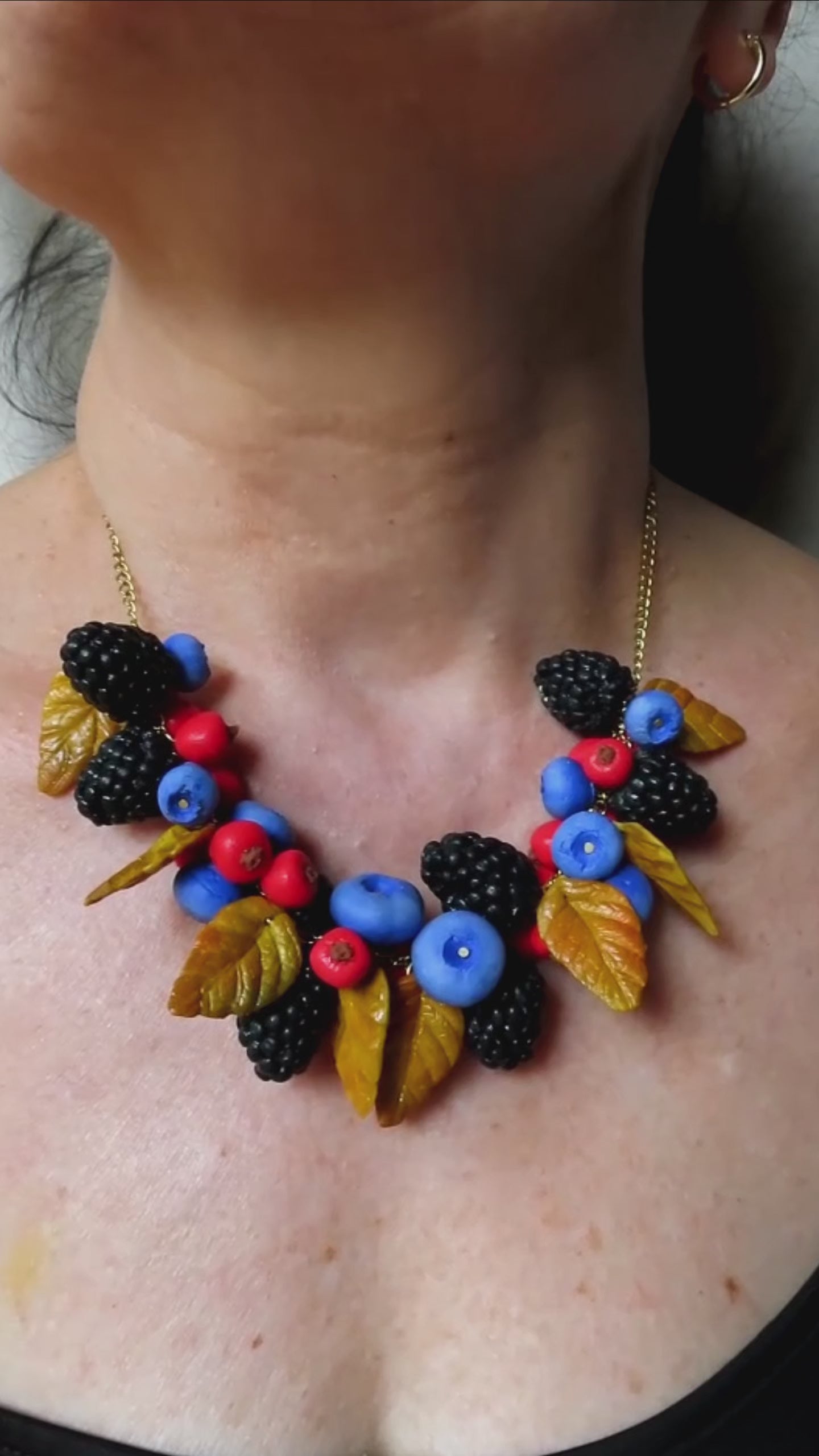 Las moras negras, los arándanos en tonos azul violáceo y las pequeñas bayas rojas han sido modelados y pintados a mano con gran detalle, creando una composición intensa y equilibrada. Las hojas en tonos dorados aportan un toque cálido que resalta los colores fríos de los frutos, evocando el contraste entre la luz y la sombra en los últimos días de otoño.